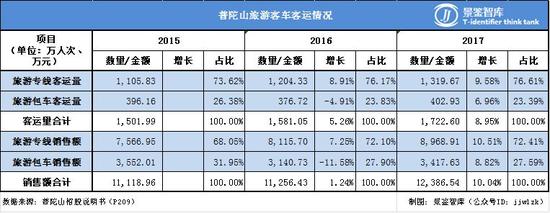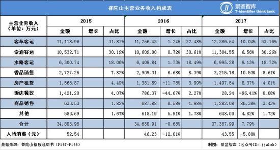像普陀山這樣的景區,游客量的增減和客運收入的增減是直接相關的,其他消費(如索道、餐飲、商品銷售等)或許不同的人群會有不同的消費選擇,但客運、水運是普陀山景區的“基礎性消費”、是“剛需”。從主營業務收入構成表上可以看到,2016年客車客運和水路客運的增長都僅有百分之一點幾,2017年增長在9%~10%,陸運水運增長量較為一致,但卻與游客增長量完全偏離。