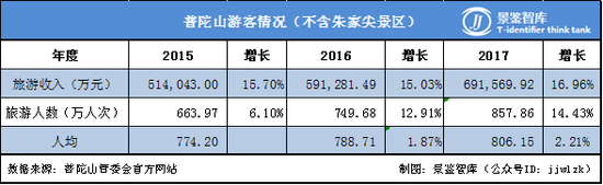 原文這么寫:“2017 年度,普陀山景區(不含朱家尖景區)接待游客 857.86 萬人次,較上年增長 14.43%,朱家尖景區接待游客 764.14 萬人次,較上年增長 17.93%,普陀山風景名勝區合計接待游客人數合計達 1,622 萬人次,較上年增長 16.05%。”