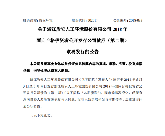 不過,5月2日盾安旗下上市公司盾安環境發布公告稱,因市場情況變化,經現有意向投資人及所有簿記參與人同意,發行人決定取消發行本期債券。后續發行計劃另行公告。