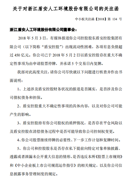 5月3日,盾安環境收到深交所的關注函,要求公司說明涉及控股股東盾安控股財務狀況的報道是否屬實,是否涉及公司債權債務和擔保;盾安控股重大不確定性事項的具體內容,以及對公司可能產生的影響;盾安控股持有公司股權的質押情況,是否存在平倉風險以及盾安控股在清償債務過程中是否可能導致公司控制權變更。