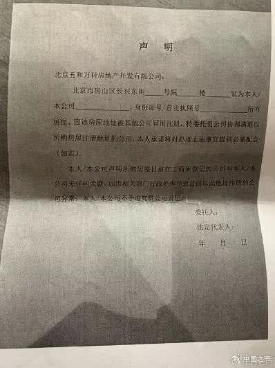 曹潔:“我們通過(guò)跟一部分業(yè)主去調(diào)取他當(dāng)時(shí)的登記材料看了一下,當(dāng)時(shí)(提交的)登記材料中,房屋所有權(quán)人的位置是由北京五和萬(wàn)科房地產(chǎn)開發(fā)有限公司作為產(chǎn)權(quán)人加蓋的公章。由于開發(fā)商的房屋所有權(quán)證是一個(gè)樓一套,并不是針對(duì)一個(gè)門牌號(hào)一套,然后他附的是對(duì)應(yīng)門牌號(hào)的那整棟樓的房屋所有權(quán)證的復(fù)印件,上面也加蓋了五和萬(wàn)科有限公司的公章。”