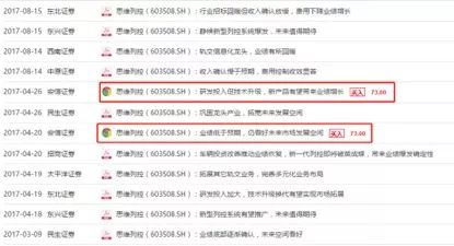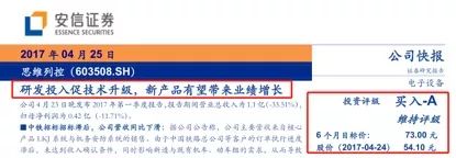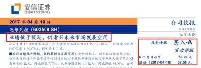 以安信證券為例,即便思維列控業績低于預期,2017年4月19日和25日還是連發兩份研報看好思維列控未來的發展空間并推薦買入,目標價均為73元。