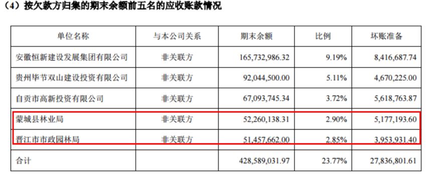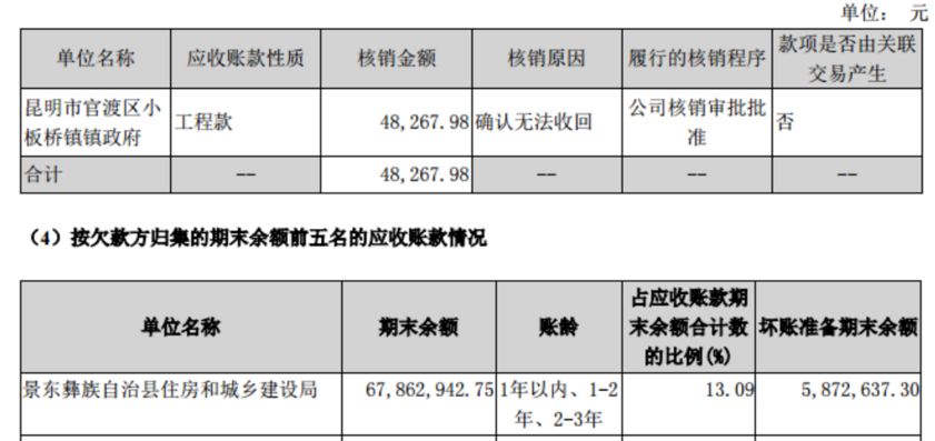 可以明顯看出,上述各家公司均以不同比例對公司與政府結算款項進行了壞賬計提,其中云投生態甚至已確認了48267.98元的壞賬損失。
