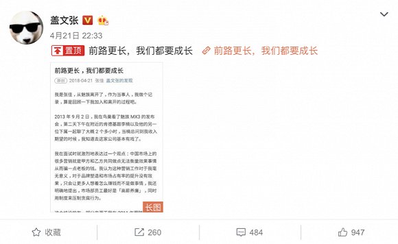 就在魅族新品發(fā)布會(huì)前夜,魅族前總監(jiān)張佳再度發(fā)聲,在微博和微信公眾號(hào)上同時(shí)發(fā)布了長(zhǎng)文《前路更長(zhǎng),我們都要成長(zhǎng)》。